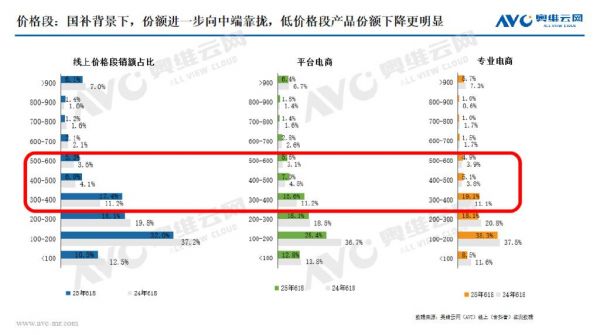 从不同价格段来看,用户往往倾向于在同等预算和价位的情况下购买更高品质的产品,低价格段的份额占比持续缩减,中端产品的占比增长,也是消费升级的表现之一。
