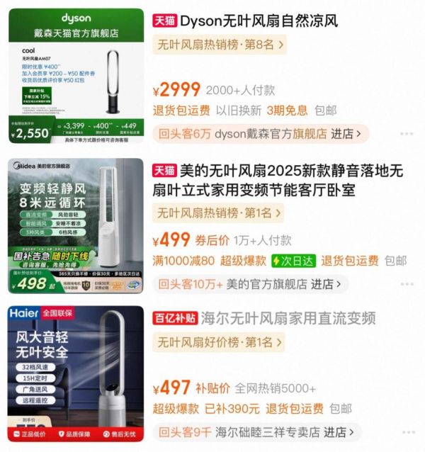 比如,戴森推出了一款AM07无叶风扇,售价2999元,国产品牌的同类产品售价普遍在500元左右,而颜值溢价和品牌溢价在家电市场上很难作为常规武器,更像是段誉的六脉神剑。