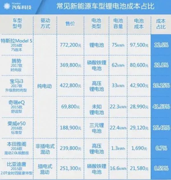 图/常见新能源车型锂电池成本占比,来源/互联网 新能源观截图
