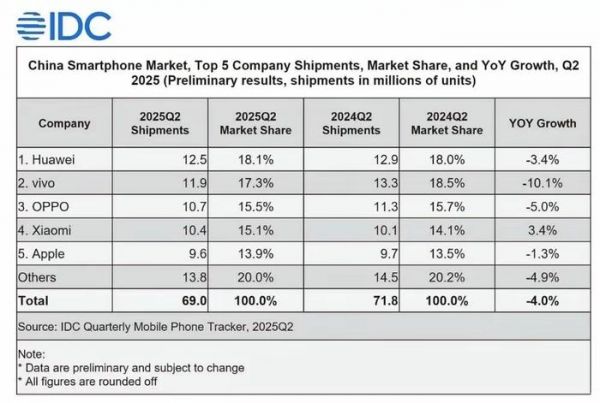 根据国际数据公司IDC最新发布的2025年第二季度报告,华为以1250万台的出货量和18.1%的市场份额,再次问鼎中国市场第一宝座。