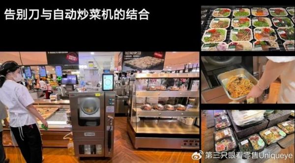 《第三只眼看零售》此前报道,经历了多年的培育期,告别刀今年开始盈利了。生鲜传奇生活馆让告别刀有了更大的陈列面积,更好的现场展示空间以及更多的关联销售机会。举例来说,在生鲜传奇生活馆卖场入口位置,便有告别刀的陈列专区,旁边有员工现场炒制给消费者进行试吃。另外,在这家店的熟食区域旁边,特别安置了一台自动炒菜机与告别刀进行联动。消费者结完账之后投入炒菜机便可获得现场即食的一盘菜。
