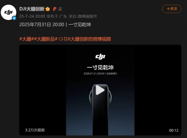 近日,DJI 大疆创新(以下简称 “大疆”)正式官宣:将于 7 月 31 日推出旗下首款 360 度全景相机 Osmo 360,其宣传语(slogan)为 “一寸见乾坤”。