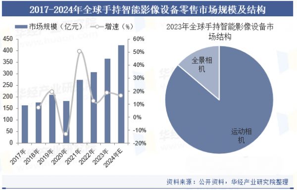 根据中研普华产业研究院《2024~2029年中国消费级无人机行业深度调研及投资机会分析报告》,2023年,全球消费级无人机市场规模约为48.5亿美元(约合人民币348亿元),其中大疆占据70%左右的市场份额。另有数据显示,2023年,全球手持智能影像设备市场规模则约为315亿元,其中,运动相机占比超过85%,全景相机仅占25%,影石的优势品类更为小众。