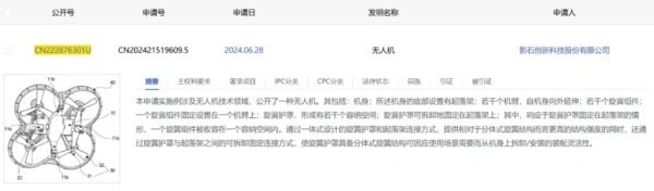 通过影石申请的无人机专利管中窥豹,专利公开号为“CN222876301U”的“无人机”专利显示,一体式设计的旋翼护罩和起落架可实现更高结构强度、并可根据使用场景灵活拆卸或安装;专利公开号为“CN222808315U”的“一种机臂组件及无人机”专利,则优化了无人机的重量与气动阻力,有助于提升续航。如果专利技术能够有效转化为使用体验的提升,有助于影石开拓市场。