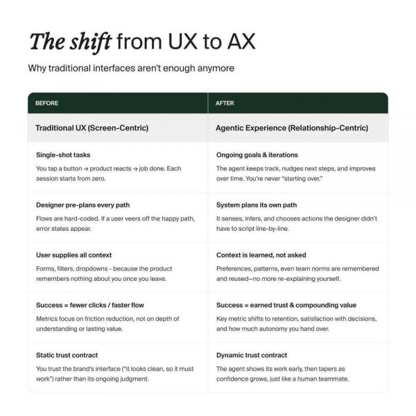 可以看到,AX并不是单纯的UI/UX的翻版,而是从根上重构交互逻辑:如何与一个拥有一定感知、具备主动性和路径选择能力的系统协作。