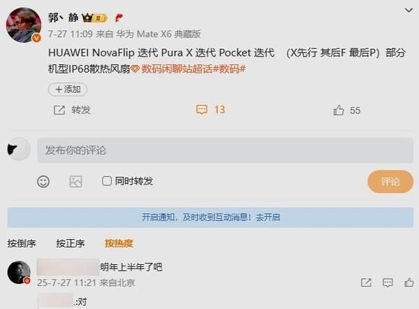 【CNMO科技消息】近日,网友爆料称华为将推出三款折叠屏迭代机型,时间可能在2026年上半年。据透露,新品将包含Pura X系列迭代、nova Flip小折叠升级版及Pocket系列新款,其中部分机型或支持IP68防尘防水并首次加入散热风扇设计。