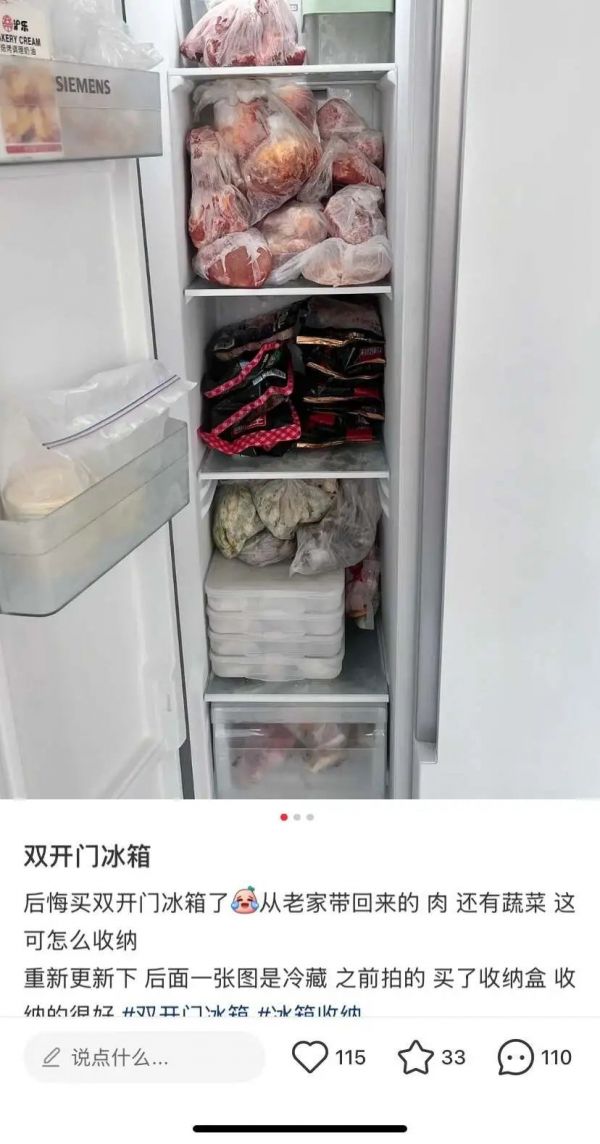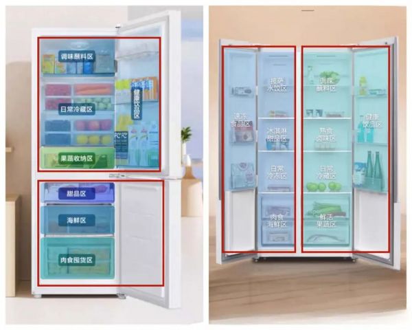 更何况,虽然外观看着大气,但内部空间却存在明显的短板。很多传统对开门冰箱没有变温区,只有冷藏 、冷冻功能,无法满足多样化的保鲜需求。而且冷藏冷冻还是两个大功能区,分类模糊,食材容易乱堆乱放,可能会被遗忘。同时,同样的容量范围内,日式、法式和十字门式都有大而完整的横向空间,但对开门的横向空间被隔板分开,豆角、长茄子这类比较长的蔬菜都得切段才能放下。