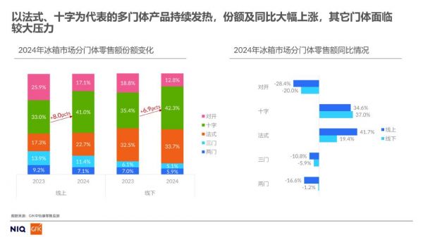 从销售数据上来看,多门冰箱也更受欢迎。据Gfk中国发布的《中国冰箱零售市场2024年总结暨2025年展望》统计,2024年,以法式、十字门体为代表的多门体产品持续发热,双线市场的零售额同比都实现了两位数增速;其中,十字门体的双线市场份额与去年同期相比,分别提升了8.0和6.9个百分点。