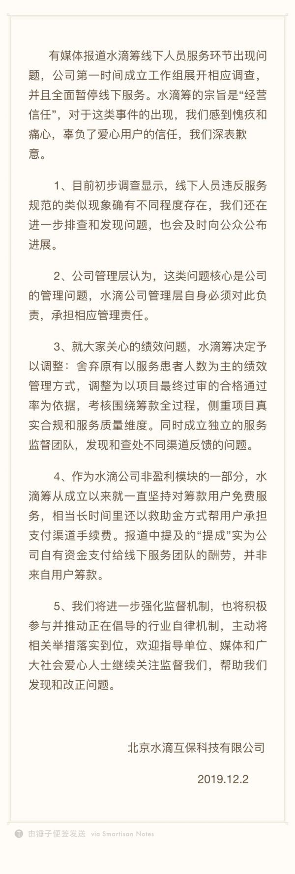 有媒体报道水滴筹线下人员服务环节出现问题,公司第一时间成立工作组展开相应调查,并且全面暂停线下服务。水滴筹的宗旨是“经营信任”,对于这类事件的出现,我们感到愧疚和痛心,辜负了爱心用户的信任,我们深表歉意。