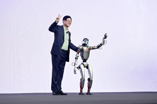 在5月的联想创新科技大会上,杨元庆与联想乐享壹号,也是首位“硅基员工”合影。