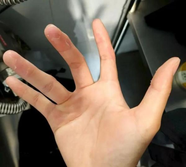 在社交平台上,唐禹晒出了自己的右手,除了小拇指,其他四个手指上都有大面积的破损,这是在茶饮店后厨泡茶时,接触热烫的器具后,又长时间在水里浸泡形成的外伤。