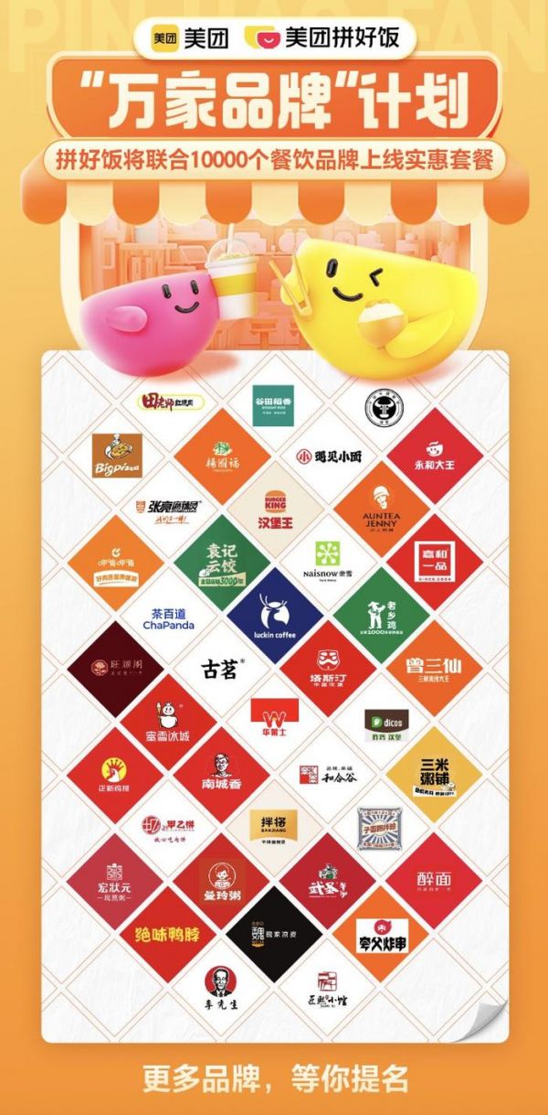 拼好饭还启动了万家品牌计划,将引入1万家知名餐饮品牌,通过数据运营、消费洞察等能力,联合商家定制产品、设计套餐,给用户带来更多高性价比的品牌套餐。目前入驻的餐饮品牌已超过5000个。像蜜雪冰城、塔斯汀、华莱士、正新鸡排、汉堡王、老乡鸡、南城香、魏家凉皮、古茗、茶百道、沪上阿姨、绝味鸭脖、永和大王等众多知名品牌都已入驻。这些品牌商家凭借自身成熟的运营体系和严格的质量把控,为拼好饭的品质提升奠定了坚实基础。