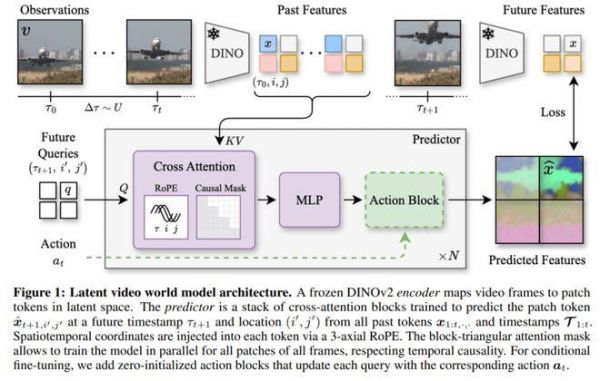 图 1 概述了 DINO-world 主要组件,包括帧编码器(frame encoder)和未来预测器(future predictor)。