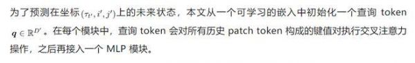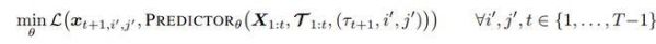 训练目标。为了便于并行化,本文采用「下一帧预测」作为训练目标,即令 t′ = t + 1,并使用 teacher forcing 策略。在给定 T 帧的序列下,关于第 t+1 帧的查询只能访问到第 t 帧及之前的 patch token。对于参数为 θ 的预测器,其训练目标如下: