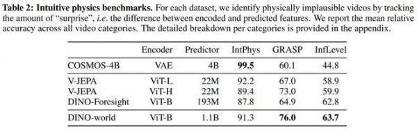 表 2:直觉物理测试基准,报告了所有视频类别的平均相对准确率。