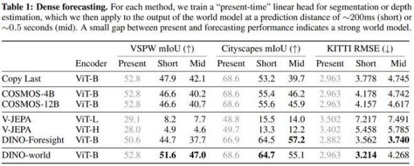表 1:密集预测。当前表现与预测表现之间的差距越小,说明世界模型越强。