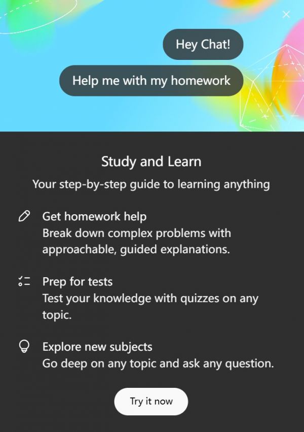 我们也做了一些简单的尝试,进入 ChatGPT 界面选择学习模式后,首先会弹出这样一个引导,其中写到该模式可以帮助完成家庭作业、准备考试以及探索新主题。