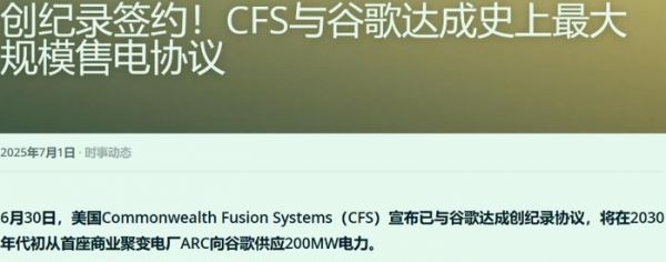 当然,也正是因为核聚变如此重要,中美之间的战略竞赛,已经到了刺刀见红的最后阶段。就在中国聚变能源公司成立前20天,美国核聚变公司Commonwealth Fusion Systems,与谷歌公司签署了一笔全球最大的售电协议,根据协议,CFS将在2030年代初从首座商业聚变电厂ARC向谷歌供应200MW电力。