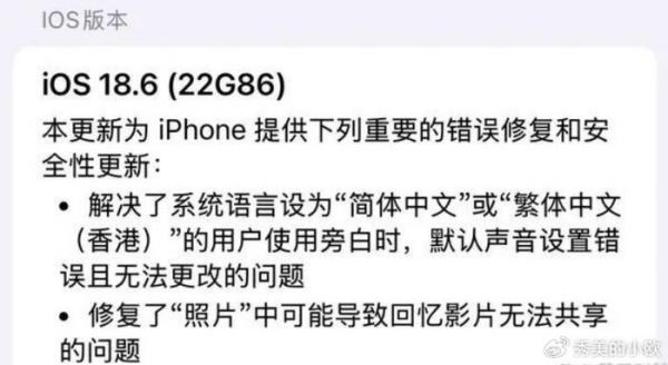 从软件更新页面的更新日志来看,iOS 18.6 正式版主要是错误修复和安全性更新,具体包括: