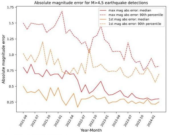 在过去三年里,随着检测系统的不断改进,AEA的震级估算准确性有了显著提升,首次震级估算的绝对误差中位数从0.50降低到了0.25。