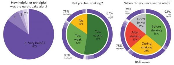 在所有受访者中,85%的人表示预警“非常有帮助”。36%的人表示在有震感之前收到了警报,28%的人在有震感期间收到,23%的人在震感结束之后收到。