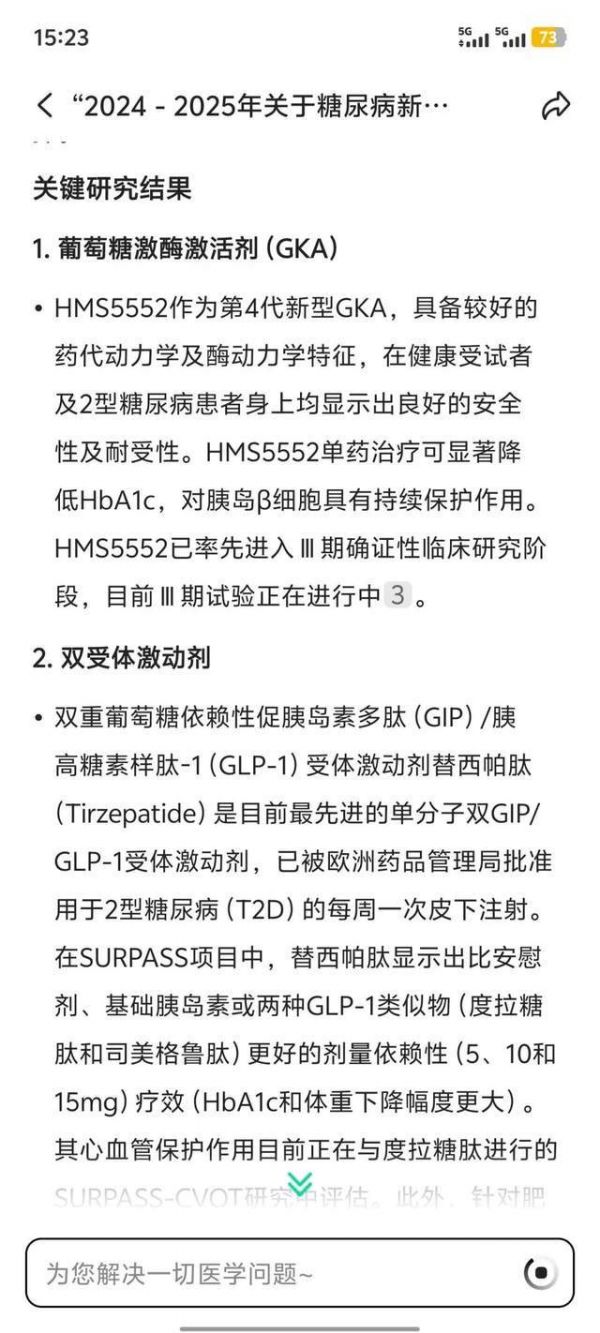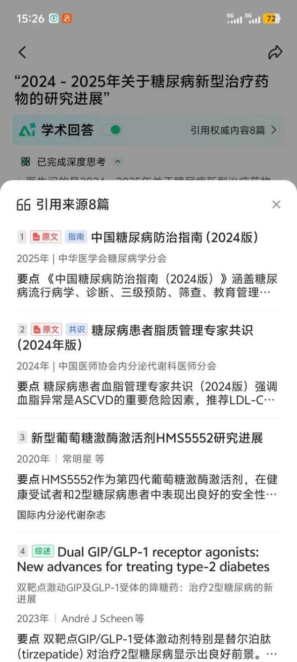 《新智核》以“2024 - 2025年关于糖尿病新型治疗药物的研究进展”这样一句话进行搜索,很快就得到了一系列高度相关的文献资料。