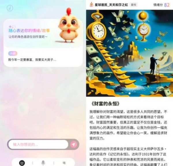 譬如,选择艺术星球后,用户可以通过发送情绪化的提示词,生成“艺术品”。