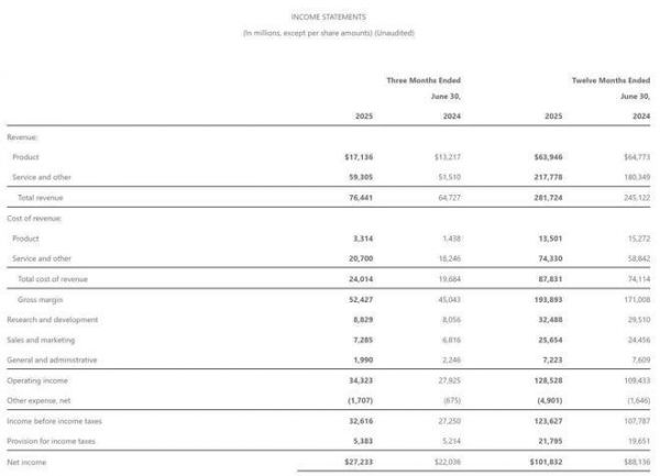 微软2025年第二季度净利为272.33亿美元,较上年同期的220.36亿美元增长24%。