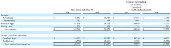 Meta在2025年第二季度来自Family of Apps收入为471.46亿美元,上年同期为387.18亿美元;来自Reality Labs收入为3.7亿美元,上年同期为3.53亿美元。