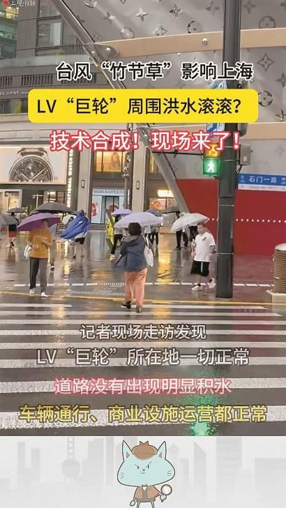 有的通过技术软件,为石门一路上的LV“巨轮”加上“洪水滔滔”的背景,以及巨轮漏水的细节。可事实是,石门一路并没有出现严重积水,车辆正常通行,LV“巨轮”及周边建筑、商场全部正常运营。