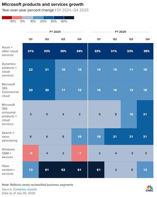 2025财年,微软智能云业务实现1062.65亿美元营收,同比增长21%。其中,服务器产品及云服务收入同比增长23%;Azure和其他云服务收入同比增长34%;服务器产品收入同比下降3%;企业及合作伙伴服务收入同比2%。