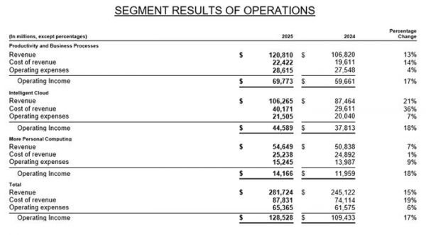 2025财年,微软全年营收较上一财年增长超366亿美元,增幅为15%,营业利润增长了101亿美元,增长率为17%。