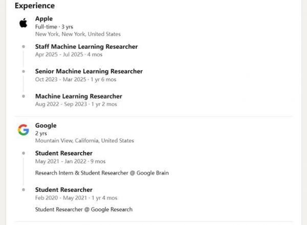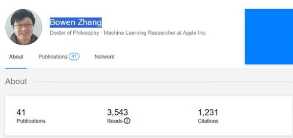 领英主页显示,张博文本科、硕士均毕业于同济大学,后前往南加州大学完成博士学位,师从知名华人AI学者沙飞教授。张博文于2022年8月加入苹果,一直从事机器学习相关工作,此前,他曾在谷歌、AWS、腾讯等公司实习,并担任谷歌研究院的学生研究员。