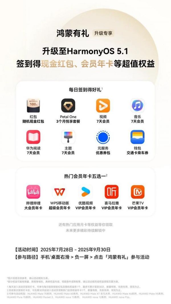 为了鼓励广大用户升级体验鸿蒙5.1,7月28日,华为公司宣布启动“HarmonyOS鸿蒙有礼升级有礼”活动,共同体验鸿蒙生态带来的便捷与高效。根据活动规则,凡在活动期间将手机系统从HarmonyOS 5.0及以下版本升级至HarmonyOS 5.1的用户,均有机会参与此次活动并赢取丰厚奖励。