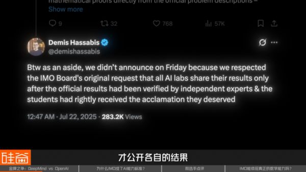 这个组委会亲自背书的待遇,却没有给到OpenAI。Demis Hassabis甚至特意下场,在X上表示:我们之所以没有周五公布,是因为我们尊重IMO组委会最初的请求。所有AI实验室都应该在官方成绩经过独立专家验证,并且参赛学生已经获得应有的表彰之后,才公开各自的结果。