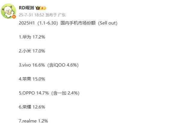 具体来看,2025年上半年手机市场份额排名依次是: