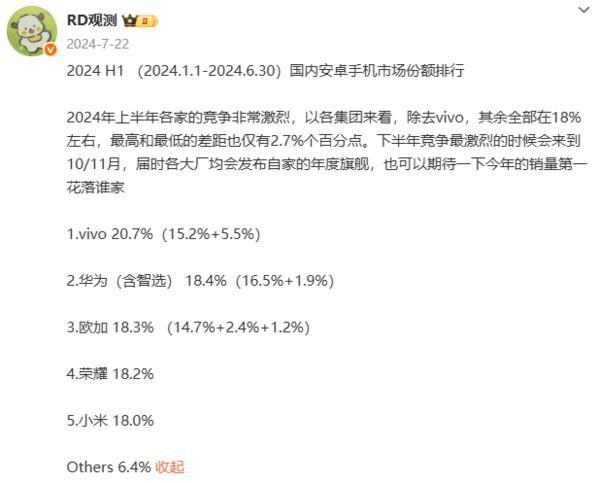 CNMO注意到,在该博主去年发布的2024年上半年(1月1日至6月30日)手机市场份额榜单中,vivo以20.7%的市场份额位居第一,而当时的华为(含智选)占比18.4%排在第二。第三是OPPO,占比18.3%;第四是荣耀,占比18.2%;小米第五,占比18.0%。