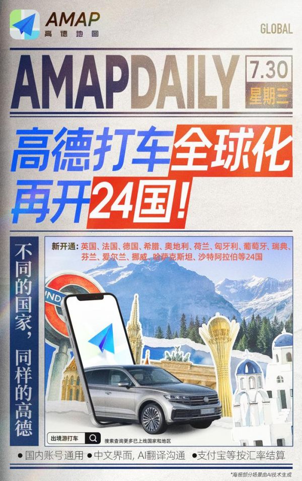 7月30日,阿里巴巴集团旗下高德地图宣布在欧洲和亚洲24个国家正式上线打车功能,分别是英国、法国、德国、希腊、奥地利、荷兰、匈牙利、葡萄牙、瑞典、芬兰、爱尔兰、挪威、克罗地亚、塞浦路斯、拉脱维亚、斯洛伐克、格鲁吉亚、波兰、爱沙尼亚、罗马尼亚、阿塞拜疆、马耳他、哈萨克斯坦和沙特阿拉伯,覆盖了巴黎、伦敦、慕尼黑、阿姆斯特丹等热门旅游城市。