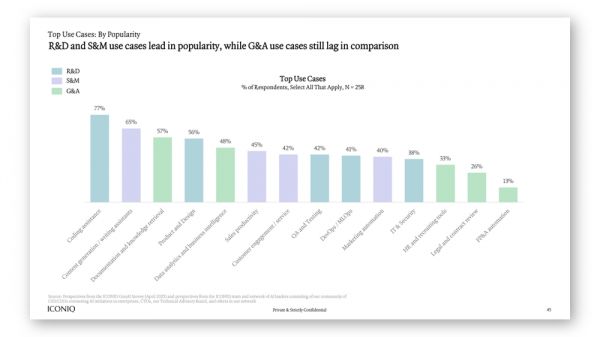 此外,也越来越多的人开始使用AI编程,根据ICONIQ日前发布的2025人工智能现状报告,里面显示「代码助手」是所有应用场景中使用人数最多的一个方向。