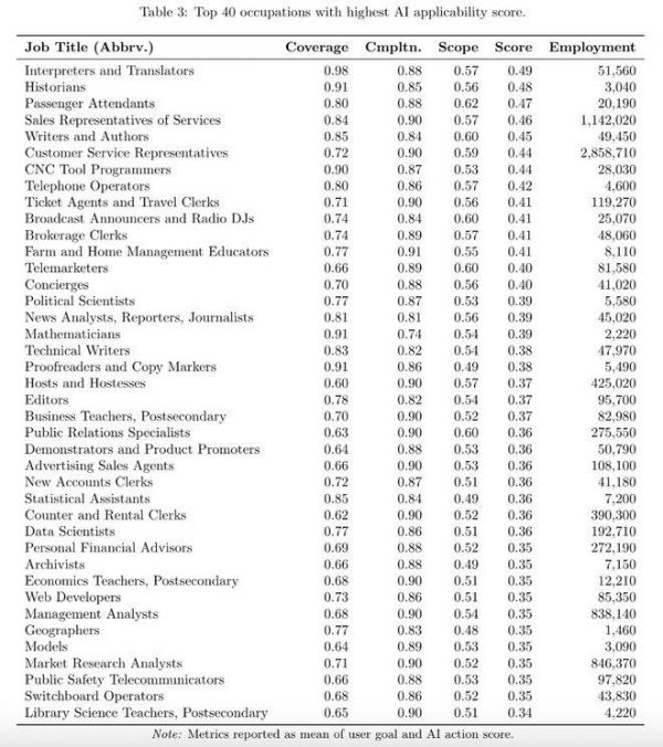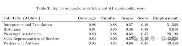 根据得分情况列出了40种最受AI影响的职业榜单。其中得分最高也就是最受影响的职业是翻译员、销售等,AI覆盖率和成功率都在80%以上,适用性近50%。