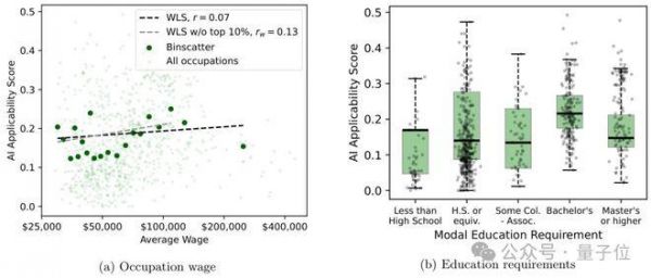 还有就是,虽然要求“学士学位及以上”的职业,AI适用性分数比低学历要求的职业稍高(平均高5%-8%),但这种关联并不绝对。