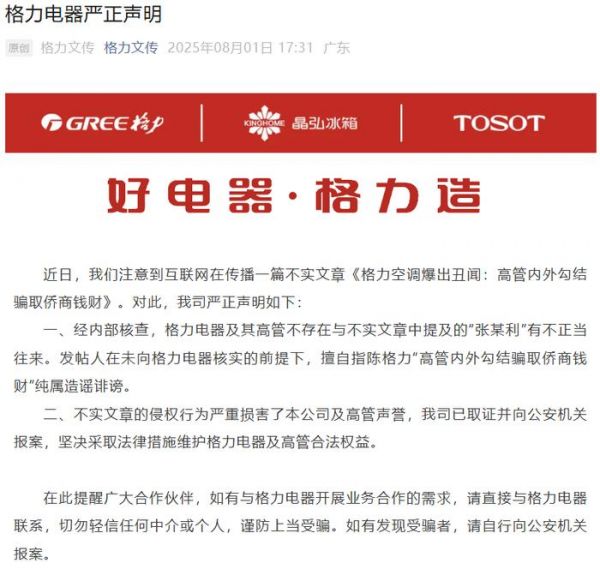 8月1日,珠海格力电器股份有限公司文化传媒中心微信公众号“格力文传”发布声明: