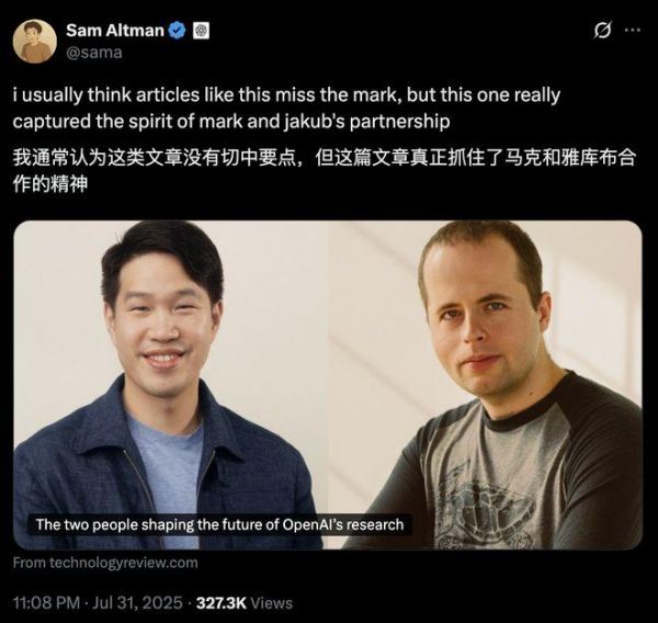 随后OpenAI联合创始人兼CEO萨姆·阿尔特曼(Sam Altman)在社交平台X上转发了这篇专访文章,并评价说“这篇文章真正抓住了陈信翰和帕乔基合作的精神”。