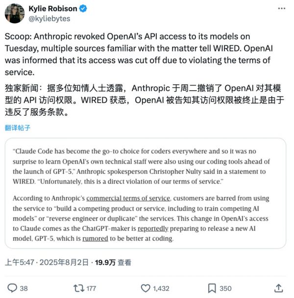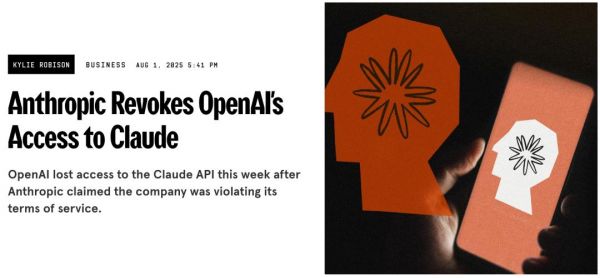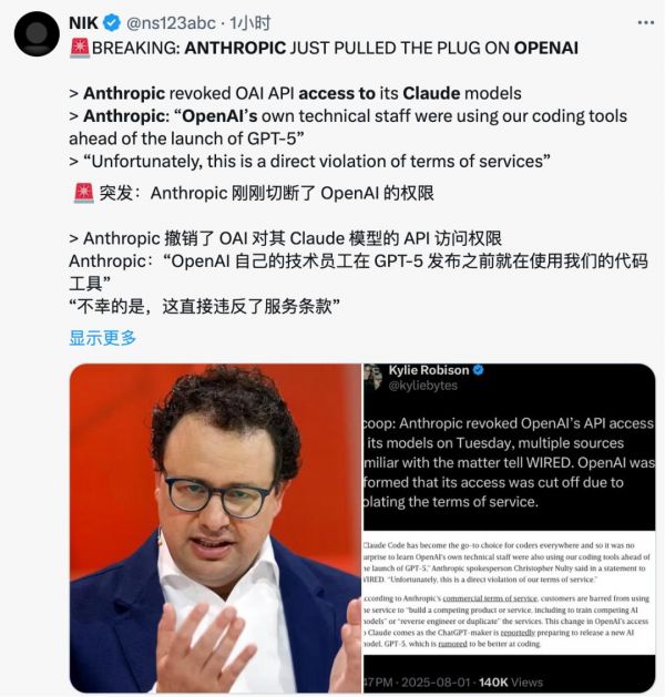 Anthropic突封OpenAI的ClaudeAPI,指其违约用Claude支援即将发布的GPT-5开发及安全测试。此举标志AI巨头围绕数据与接口展开新一轮封锁战,API成市场准入与创新博弈的战略资源,在业内引发热议与监管关注。
