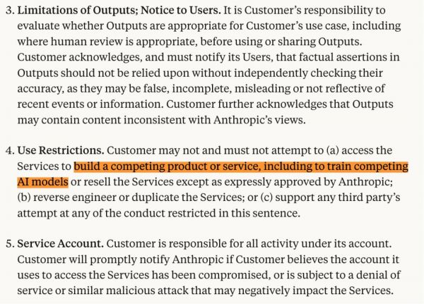 根据Anthropic的商业条款,任何客户都不得利用其服务「构建与之竞争的产品或服务,包括训练竞争性AI模型」,更不用说「逆向工程或复制」其服务了。