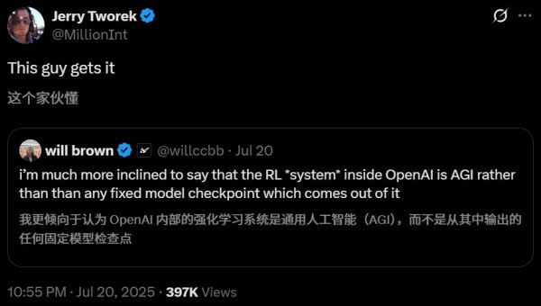 OpenAI强化学习团队负责人Tworek最近也公开表示,自己认同这个观点:OpenAI模型背后的强化学习系统,其实已经具备了通往AGI的潜力。