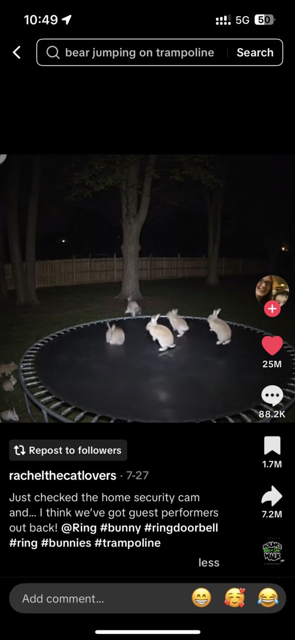 一段看起来像是夜视监控拍到的“兔子蹦床”视频,在TikTok上爆火,全网收获了有5亿次播放。