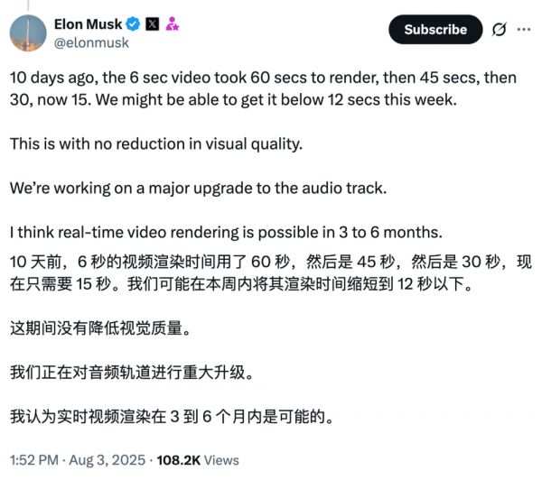 就在兔子视频引发热议的同时,马斯克也分享了AI视频技术的惊人进展。