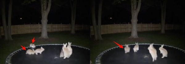 视频看上去像是某户人家的安防摄像头拍到的,灯光昏黄、画面模糊,但恰到好处地捕捉到几只兔子轮番起跳,活像在开夜间演出。