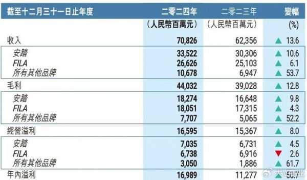 安踏公布的2024年第三季度业绩显示,安踏主品牌录得中单位数正增长,FILA录得低单位数负增长,其他品牌录得45-50%的正增长。